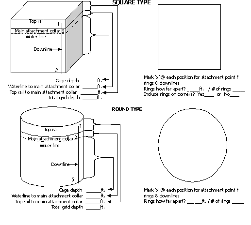 Note: Aquagrid is extended to the top rail instead of having to add an additional jump net. Cost and maintenance are lowered as well longevity is increased. Each downline will have three attachment rings: 1. Top rail 2. Main attachment collar 3. Bottom weight |