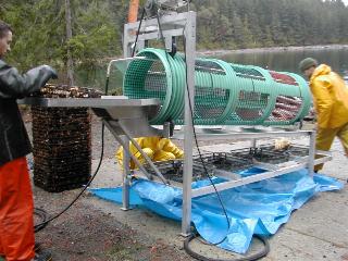 Oysters are dumped at one end the drum rotates tumbling