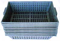 A soft plastic basket with grid sides and bottom, variety of colours.
